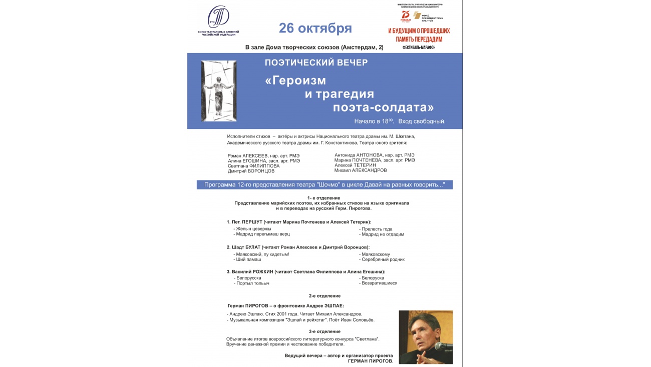 В понедельник, 26 октября, в Доме творческих союзов состоится продолжение популярного цикла поэтических вечеров «Давай на равных говорить...» в рамках проекта «И будущим о прошедших память передадим». В мероприятии примут участие артисты театров Йошкар-Олы. На мероприятии будут звучать популярные и неизвестные марийские стихотворения и их переводы на русский язык. Также состоится вручение премии «Светлана».