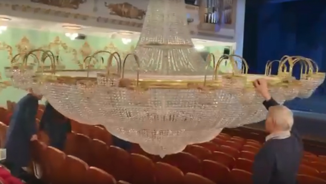 Перед встречей гостей театр наводит лоск. Так, сегодня в партер опустили пятитонную люстру из испанского хрусталя.