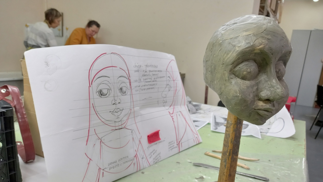 И хоть покажут восточную сказку по произведению В. Гауфа только летом, в цехах к ней уже готовятся. Сейчас здесь началась работа над куклами: лепка формы головы из пластилина и заливка формы гипсом, скоро предстоит сделать папье-маше.