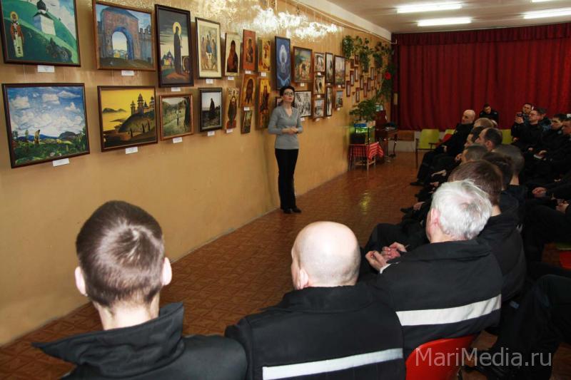 Такая возможность появилась в результате совместного проекта выставочного зала «Радуга» Национальной библиотеки им. С.Г. Чавайна и республиканского Управления Федеральной службы исполнения наказаний. В колонистском клубе была оформлена передвижная выставка «Христианские сюжеты в живописи», на которой были представлены высококачественные цифровые копии полотен русских художников 19-20 веков – Иванова, Крамского, Поленова, Рериха, Нестерова, а также репродукции наиболее известных древнерусских икон – Владимирской Богоматери, Спаса Нерукотворного, «Чудо Георгия о Змие», «Ярославская Оранта», «Борис и Глеб на конях». В свете приближающегося праздника Пасхи выставка смотрелась особенно актуально. По данным пресс-службы УФСИН по Марий Эл, несмотря на то, что выставочный зал «Радуга» достаточно загружен, рассматривается возможность того, чтобы передвижная выставка побывала и в других исправительных учреждениях республики.