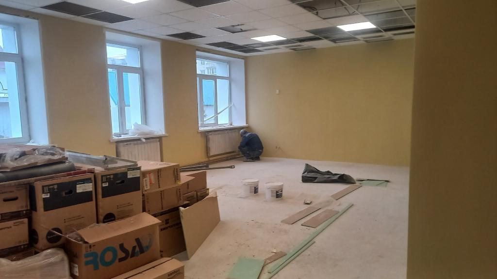 Кроме того, в фойе и коридорах кладут новую плитку, приводят в порядок кабинеты, стены и потолки, занимаются оборудованием санузлов.