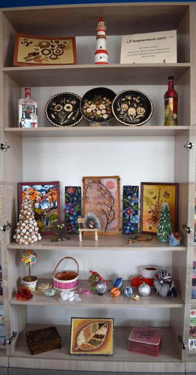На выставке представлены изделия, выполненные в техниках «топинарий» — оригинальное дерево из декоративных элементов, декупаж, «кинусайга» — художественное панно из цветных лоскутов ткани, панно из природных материалов, а также здесь можно увидеть объёмные поделки из картона и яичных лотков.