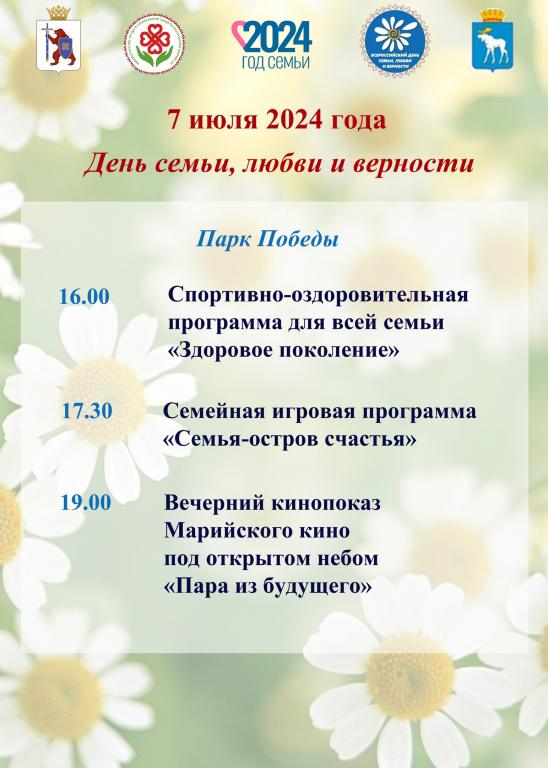 В воскресенье, 7 июля, жителей и гостей марийской столицы ждёт насыщенная программа мероприятий, посвящённых празднованию Дня семьи, любви и верности.