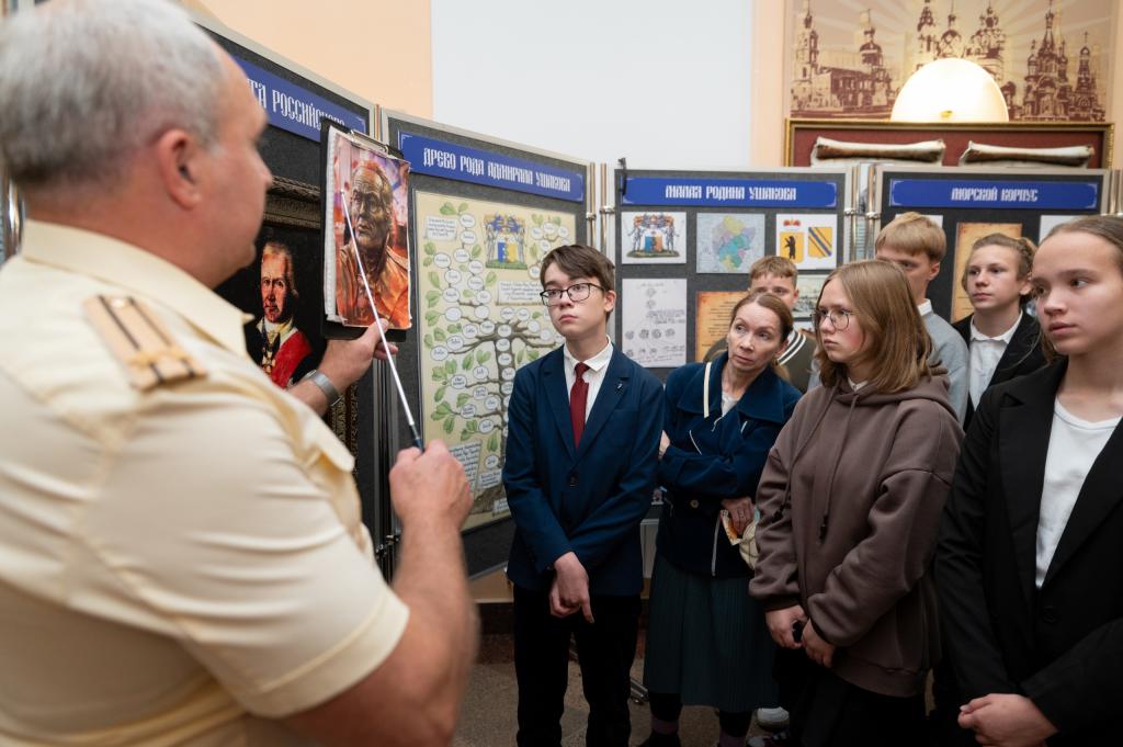 Мероприятие посетили школьники, изучающие программирование. Ребятам рассказали о жизненном пути флотоводца, боевых сражениях, наградах и показали реконструкцию мундира адмирала Фёдора Ушакова образца 1803 года.