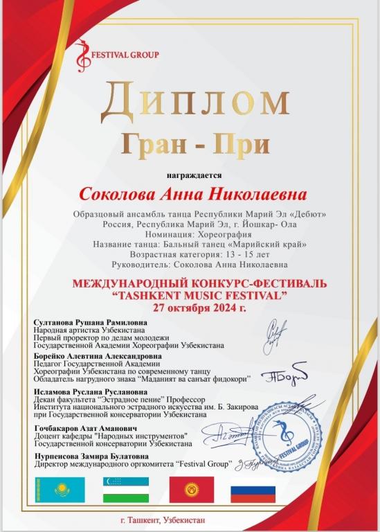 Образцовый ансамбль Марий Эл «Дебют» одержал победу на Международном конкурсе-фестивале «Tashkent music festival — 2024».