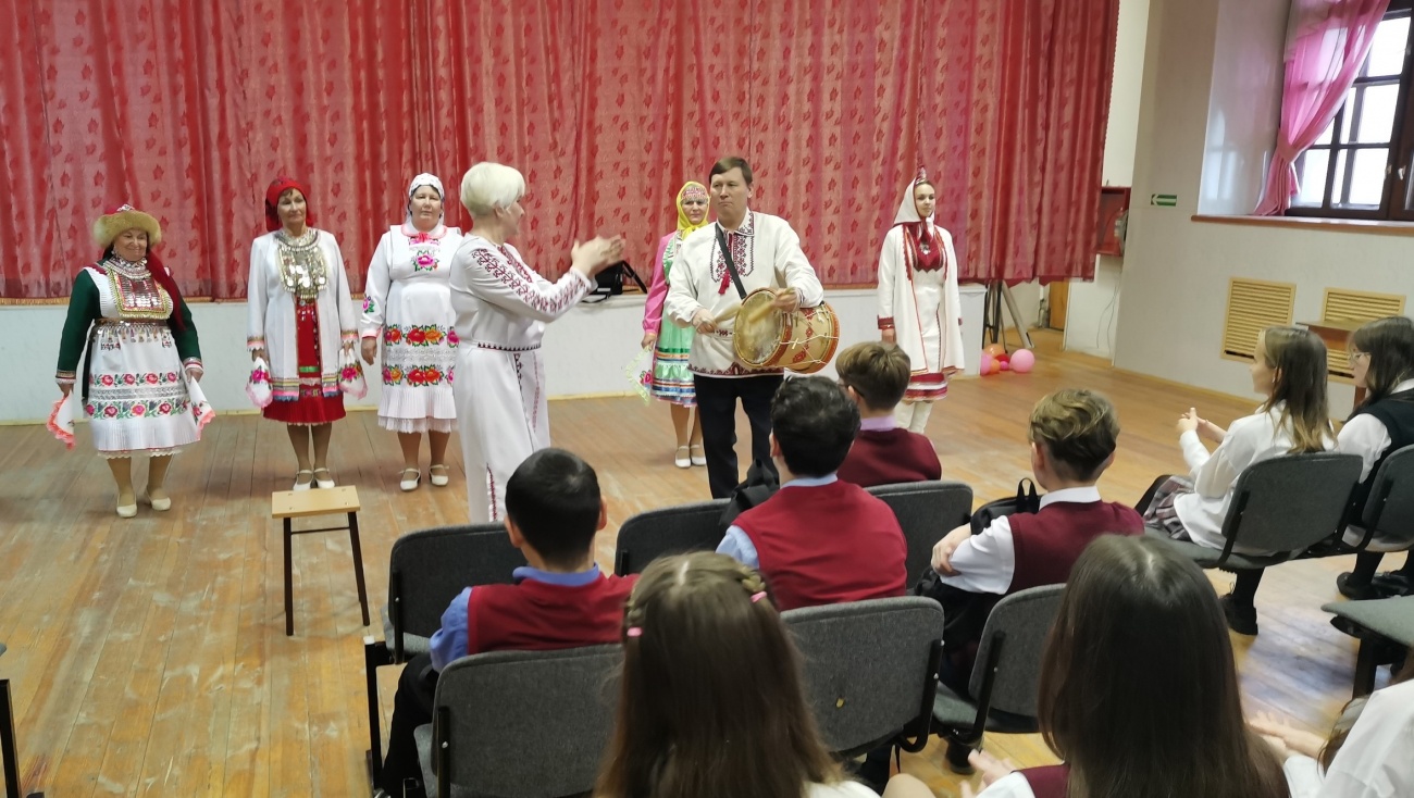 Школьникам рассказывают о богатстве, ценностях марийского народа через музыку, народные инструменты танцы и костюм.