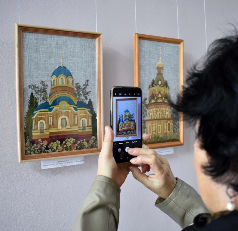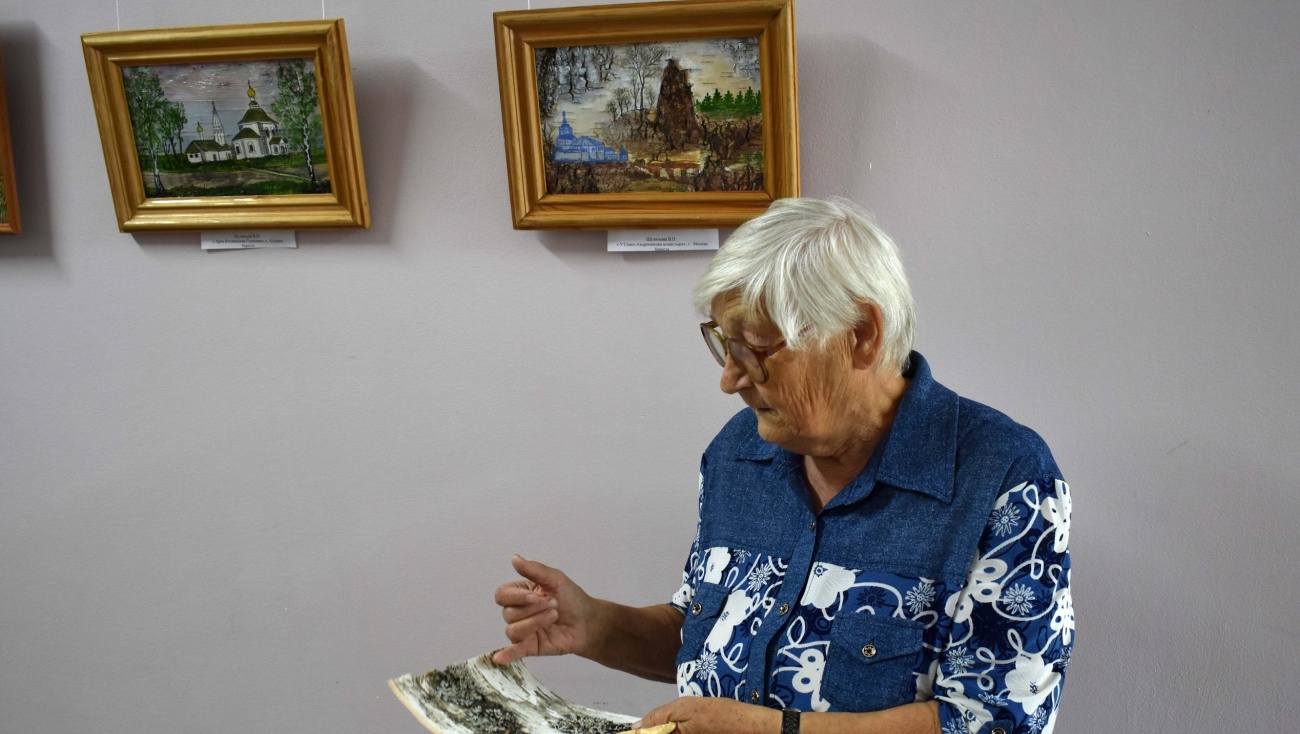 Представила экспозицию мастерица Вера Шулятьева. Здесь можно увидеть удивительные изображения церквей, созданные из соломки и бересты. Особенно примечательны картины, выполненные гуашью на бересте.