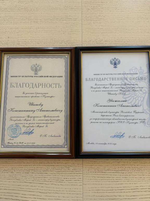 Зампредседателя Правительства Марий Эл — министра культуры, печати и по делам национальностей Константина Иванова наградили благодарностью и благодарственным письмом Министерства культуры России.