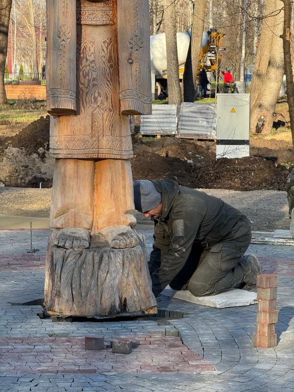 В центре композиции установят скульптуру Верховного карта — мудрого вождя и хранителя традиций. А вокруг него в виде спирали как раз и будут установлены конкурсные работы резчиков по дереву.