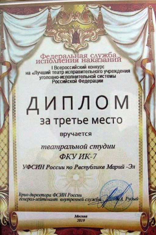 Стали известны итоги первого конкурса «Лучший театр исправительного учреждения уголовно-исполнительной системы Российской Федерации». По мнению жюри, спектакль ИК-7 «Любовь к трём апельсинам», представлявший в финале не только Республику Марий Эл, но и весь Приволжский федеральный округ, занял почётное третье место, уступив коллегам по увлечению из Тульской и Ростовской областей.