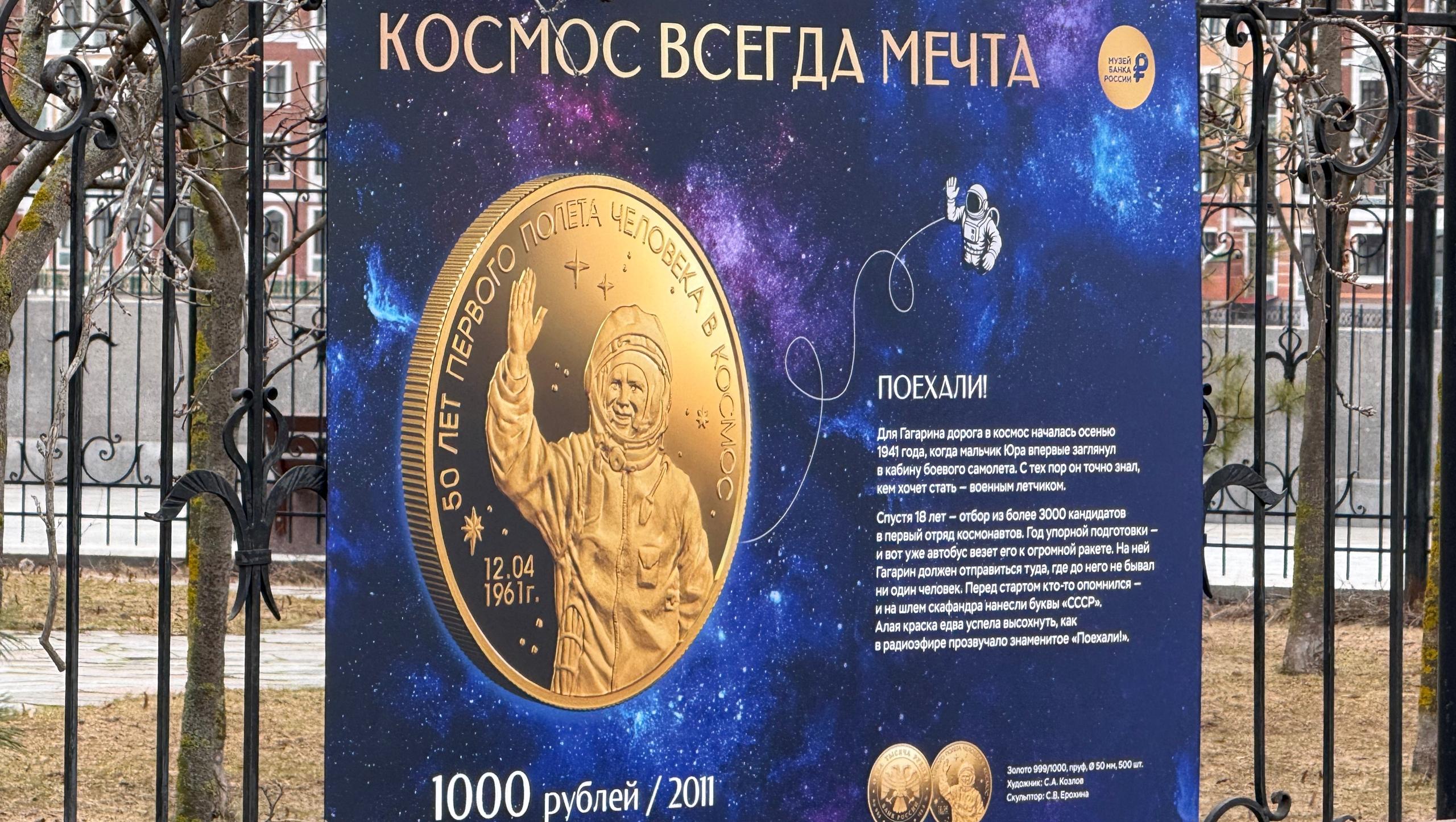 Ограждения Итальянского парка украсили панно с изображениями памятных монет о бескрайней Вселенной и таинственном космосе. Здесь можно увидеть одиноких странников лунных морей, знаменитую улыбку, открывшую эпоху, и чертежи тех, кто придумал дорогу к звёздам.