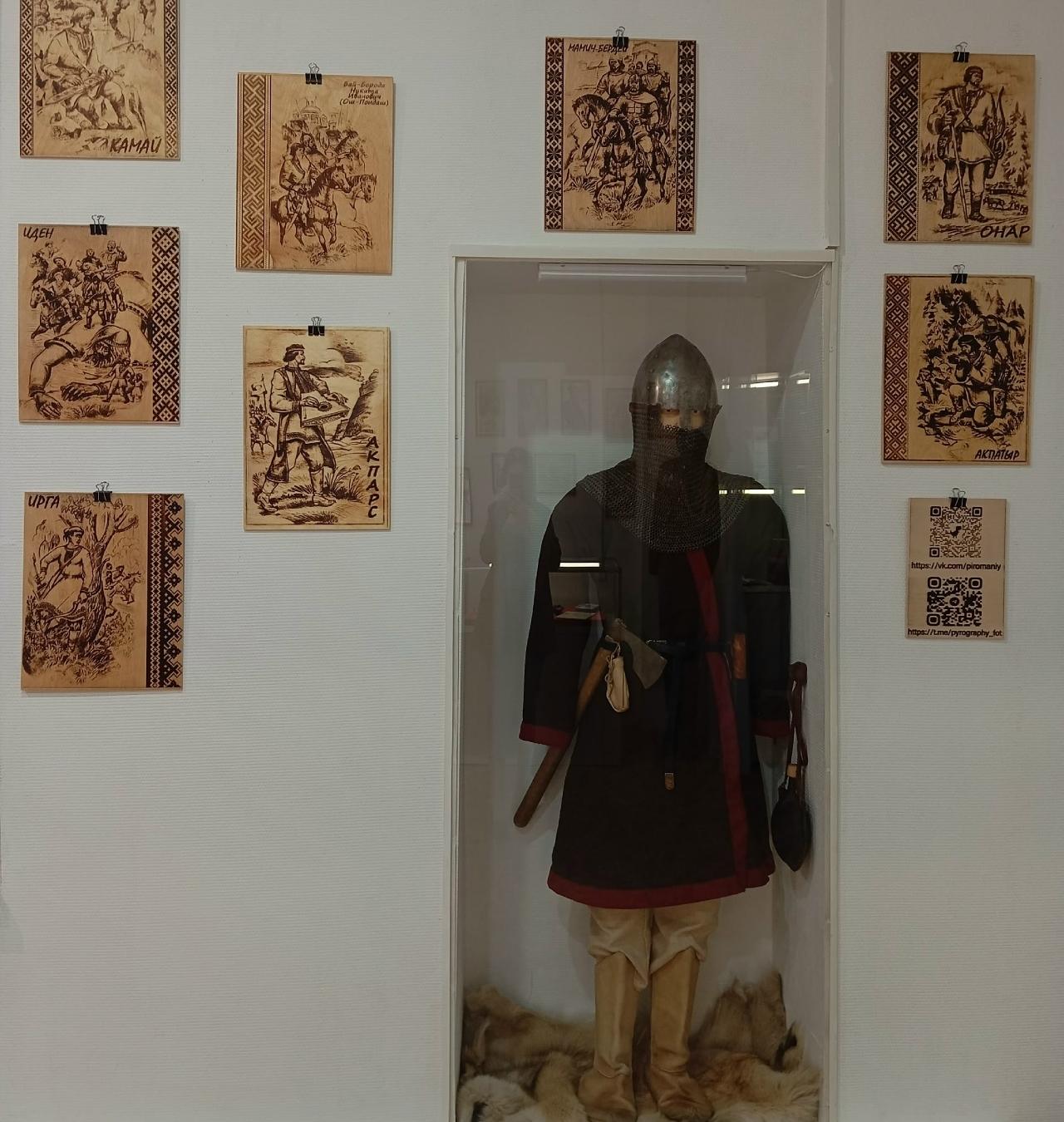 Картины с богатырями созданы не красками, а с помощью настоящего огня. Каждая деталь выжжена вручную на натуральном дереве. Это придаёт работам глубину и объём, отмечают в музее.