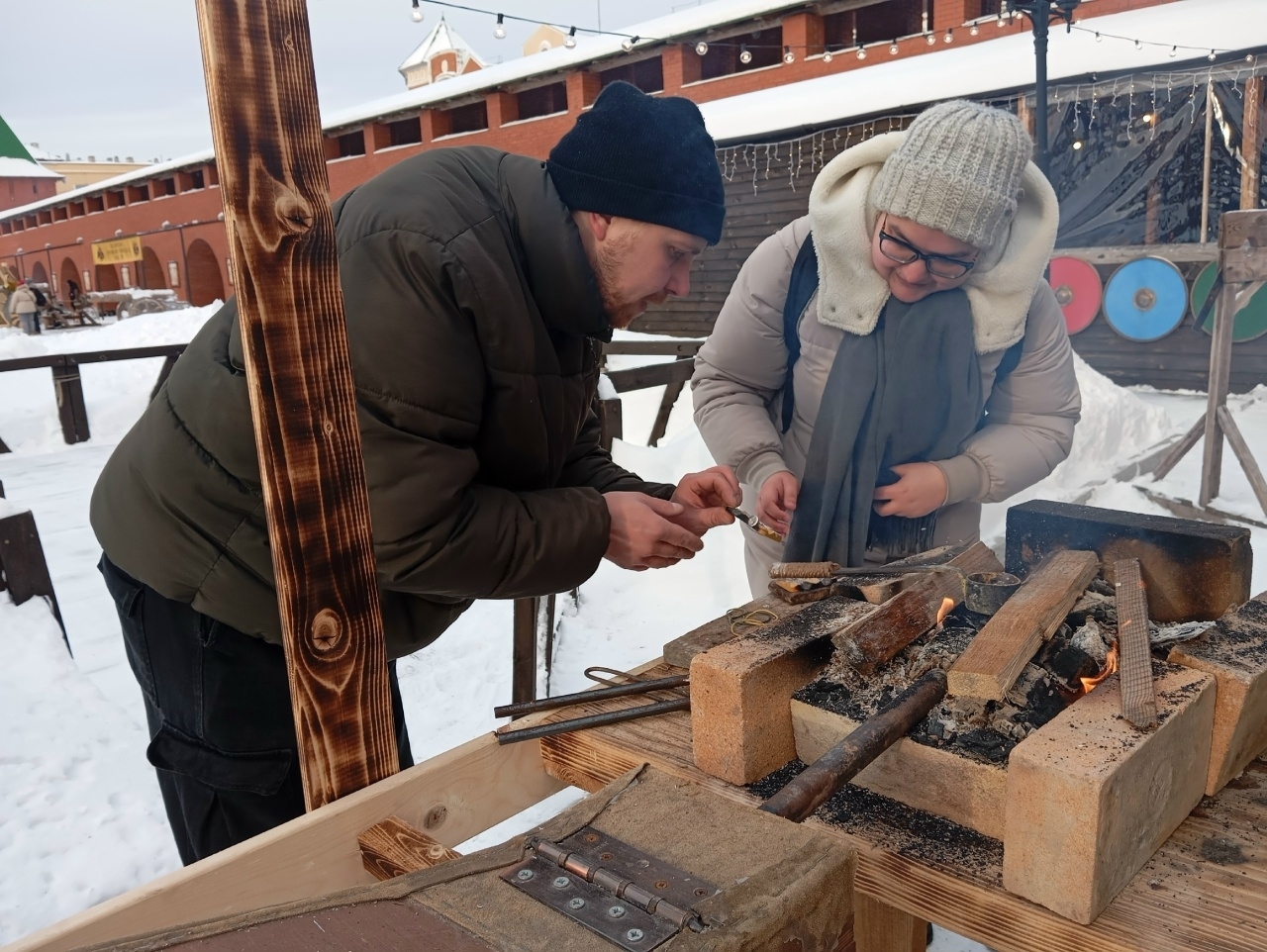 Гости праздника тоже могли проверить свою силушку. Специально для этого была организована площадка «Зимние богатырские забавы». Здесь проводились конкурсы на жим деревянной штанги лёжа, бег с коромыслом, прыжки через пеньку и перетягивание каната.