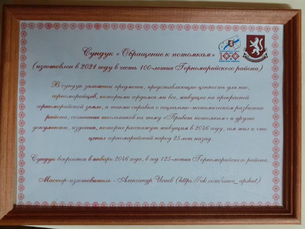 В канун Старого нового года учреждению торжественно передали сундук для потомков. Сообщается, что его специально изготовили в честь 100-летия Горномарийского района. Внутри него предметы, представляющие ценность для жителей этой местности.