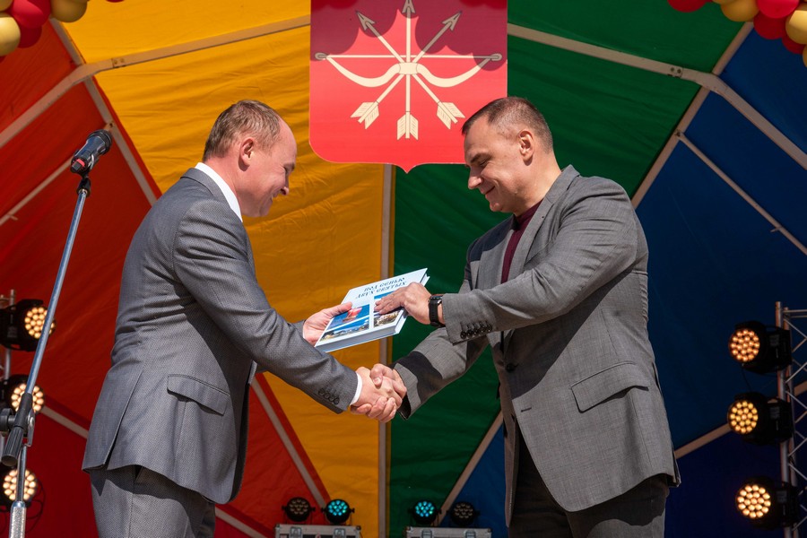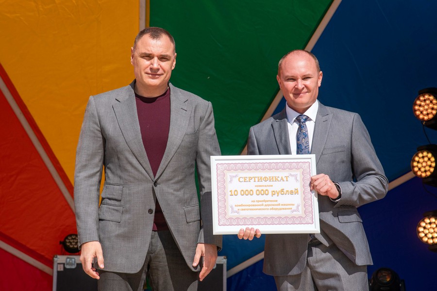 В честь юбилея он вручил градоначальнику Михаилу Козлову сертификат номиналом 10 миллионов рублей на приобретение комбинированной дорожной машины и светотехнического оборудования для города.