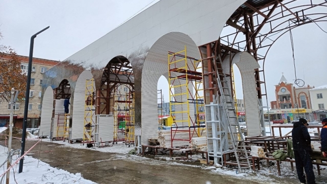 Подрядная организация занимается сейчас облицовкой конструкции многофункционального навеса — арки: внутри — древесным материалом, снаружи по периметру — серебристыми листами. На этой неделе планируют поставить скамейки и другие малые архитектурные формы.