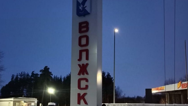 На въезде в Волжск со стороны Зеленодольска теперь встречает новая стела. В тёмное время суток на ней загорается название города.