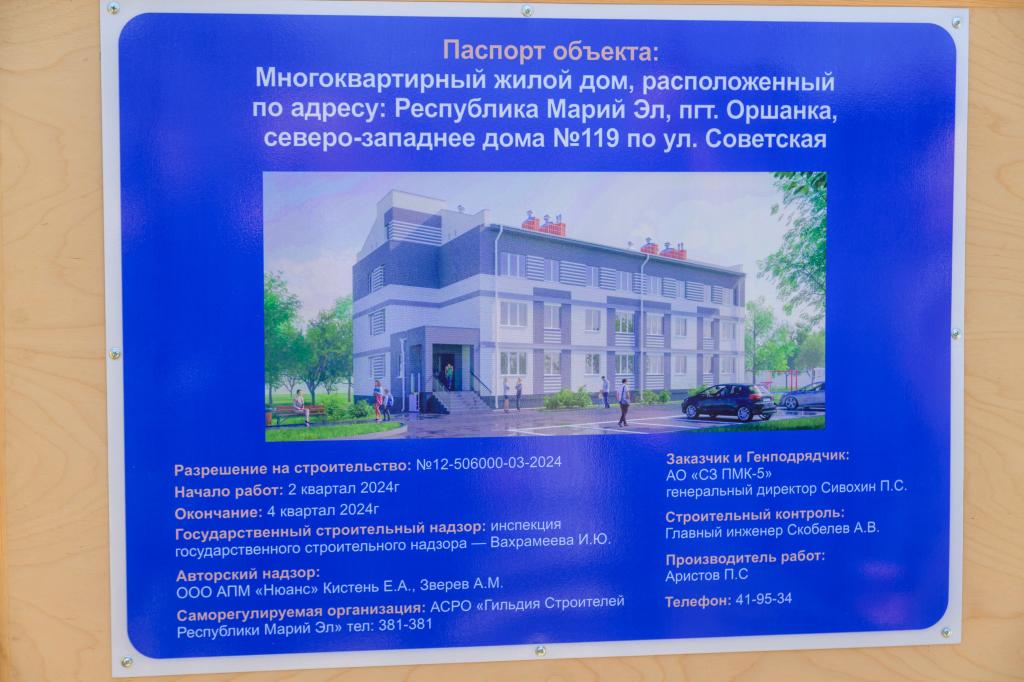 В ходе рабочей поездки в Оршанский район глава республики посетил стройплощадку. На территории посёлка ведётся строительство дома, в котором будут предоставлены квартиры детям-сиротам и детям, оставшимся без попечения родителей. Дом планируют сдать в конце этого года. Представитель подрядной организации заверил, что объект будет построен в установленные сроки.