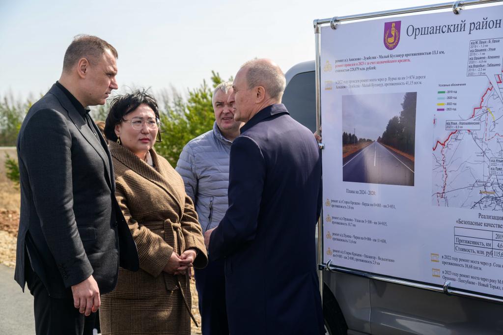 Затем руководитель региона осмотрел отремонтированную в рамках национального проекта «Безопасные качественные дороги» автомобильную дорогу Анисково — Лужбеляк — Малый Кугланур. Дорога связывает населённые пункты Оршанского района с районным центром, по ней проходят школьные и автобусные маршруты. Работы на объекте выполнены с опережением графика. Протяженность участка ремонта составила 13,4 км.