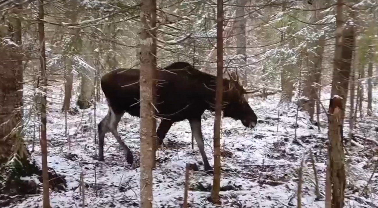 Видео было сделано ещё в ноябре, когда выпал первый снег. Обычно в конце ноября — начале декабря лоси начинают сбрасывать свои рога.