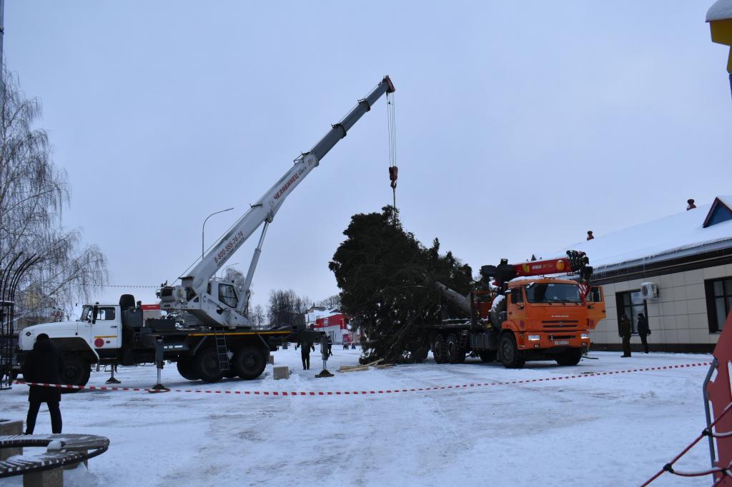 В посёлок Медведево доставили главную новогоднюю ёлку района. Традиционно её устанавливают на Юбилейной площади.