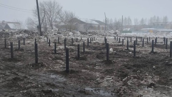 На данный момент строители устанавливают винтовые сваи под будущий объект культуры.
