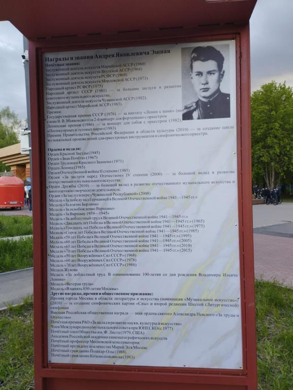 В день 100-летнего юбилея со дня рождения выдающегося советского композитора Андрея Яковлевича Эшпая на главной аллее установили щиты с информацией о биографии знаменитого земляка, о его богатом творческом наследии.