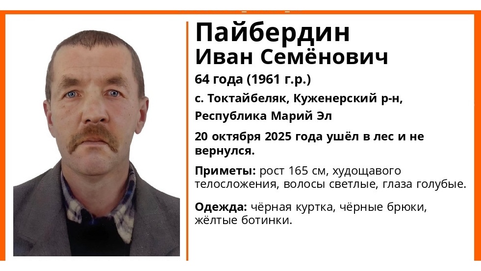 Пять дней назад, 20 октября, 64-летний житель села Токтайбеляк Куженерского района Иван Пайбердин ушёл в лес и до сих пор не вернулся.