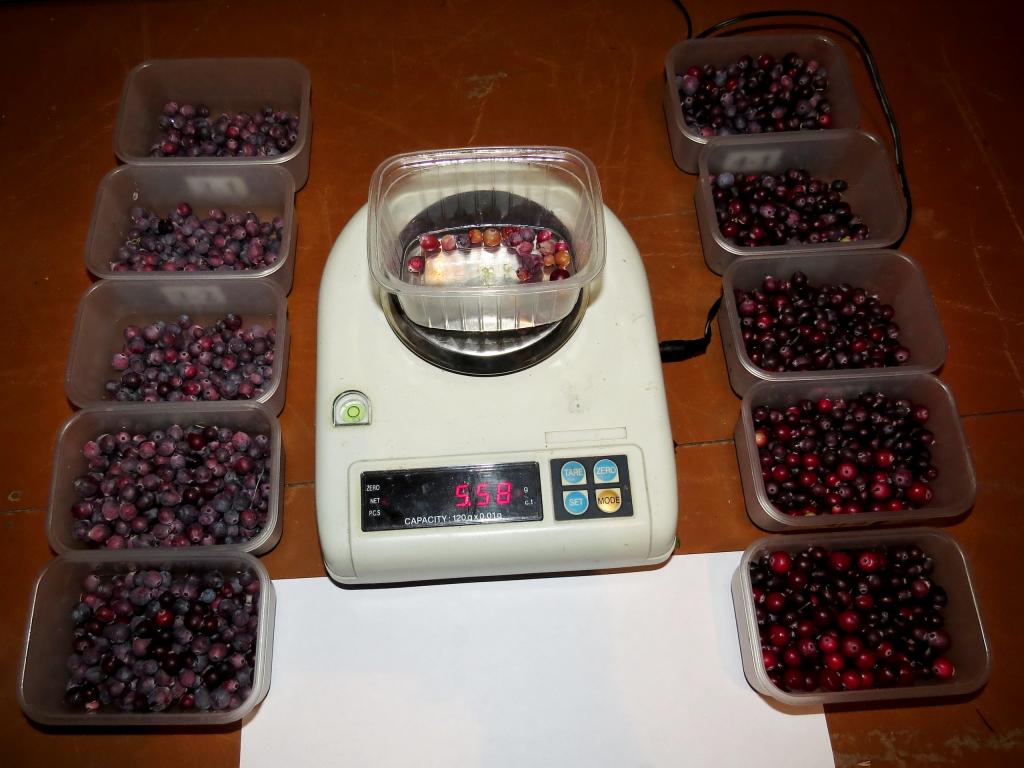- На ровном участке урожайность в переводе на гектар в этом году составила 26,13 кг/га. Для сравнения, в 2019 г — 15,7 кг/га в 2018 г — 59,6 кг/га. Незрелых ягод не было. Вес гнилых и перезревших ягод была в этом году примерно 0,36 кг/га (в 2019 г. 1,9 кг/га в 2018 г — 2 кг/га). Вес 100 ягод составил 58,98 граммов. В 2019 г. — 61,89 грамма, в 2018 г — 69,23 г). Урожайность на этой пробной площади в 2020 году была примерно в 1,7 раз больше, чем в 2019 году, но в 2,3 раза меньше, чем в 2018 году.