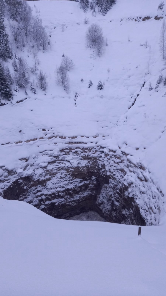 С наступлением оттепели ледовый покров обрушился и взору очевидцев предстала печальная картина. На фото видно, что образовалась пустотная «шахта» — вода полностью ушла под землю.