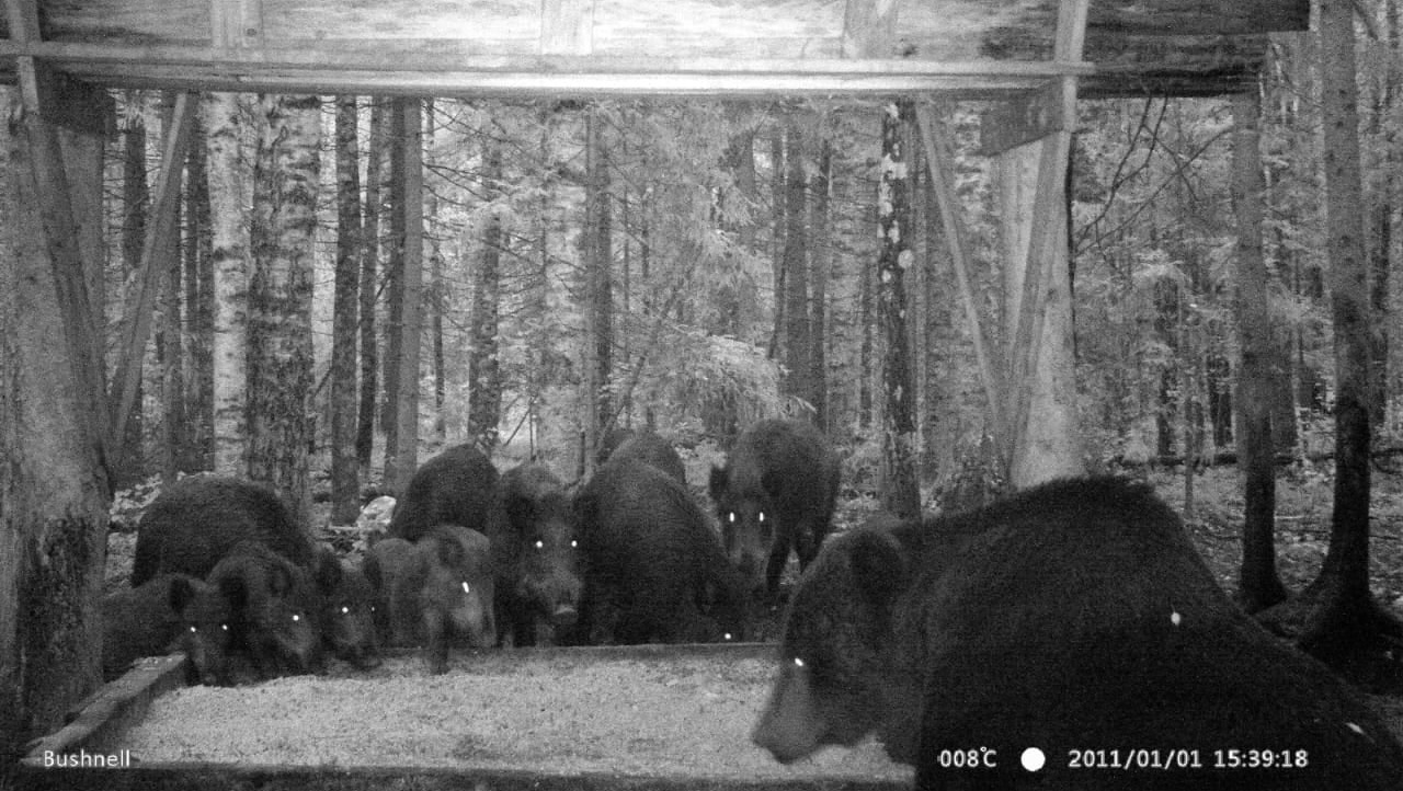 На фото 2012 года запечатлена совместная трапеза медведя и его, возможно, потенциального ужина. Смелая компания кабанов ест из общего «котла» с хозяином леса.