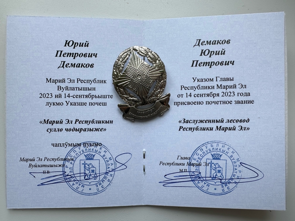 Как писало ранее ИА МариМедиа, Указом главы Марий Эл от 14 сентября 2023 года почётное звание «Заслуженный лесовод Республики Марий Эл» присвоено Демакову Юрию Петровичу.