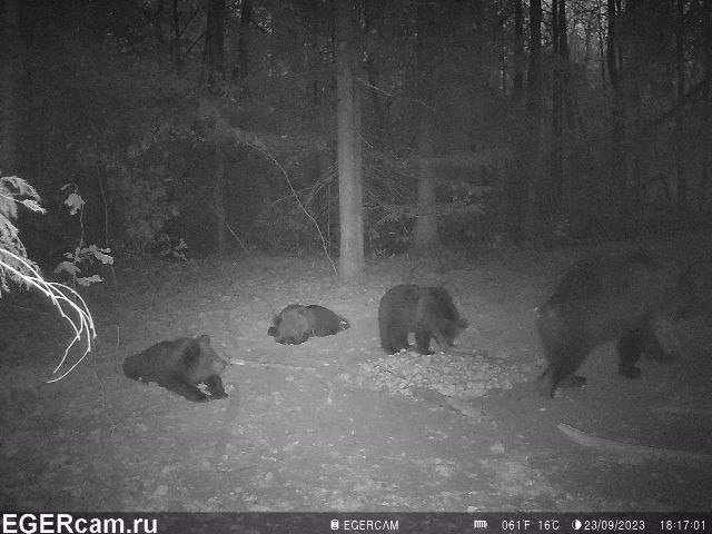 Медведицу и трёх подросших за лето медвежат запечатлела фотокамера. Примечательно, что многочисленное семейство два дня «позировало» на камеру, играя со светотенью.