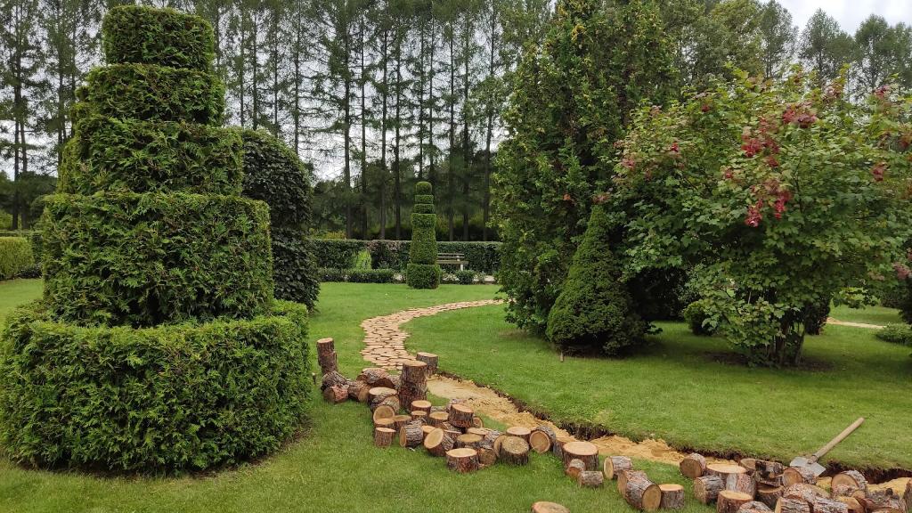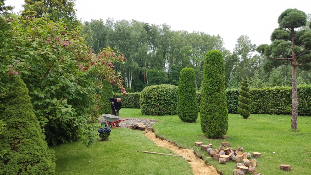 На экспозиции «Партер с элементами топиарного искусства» в Ботаническом саду Йошкар-Олы реставрируют дорожки из древесных спилов.