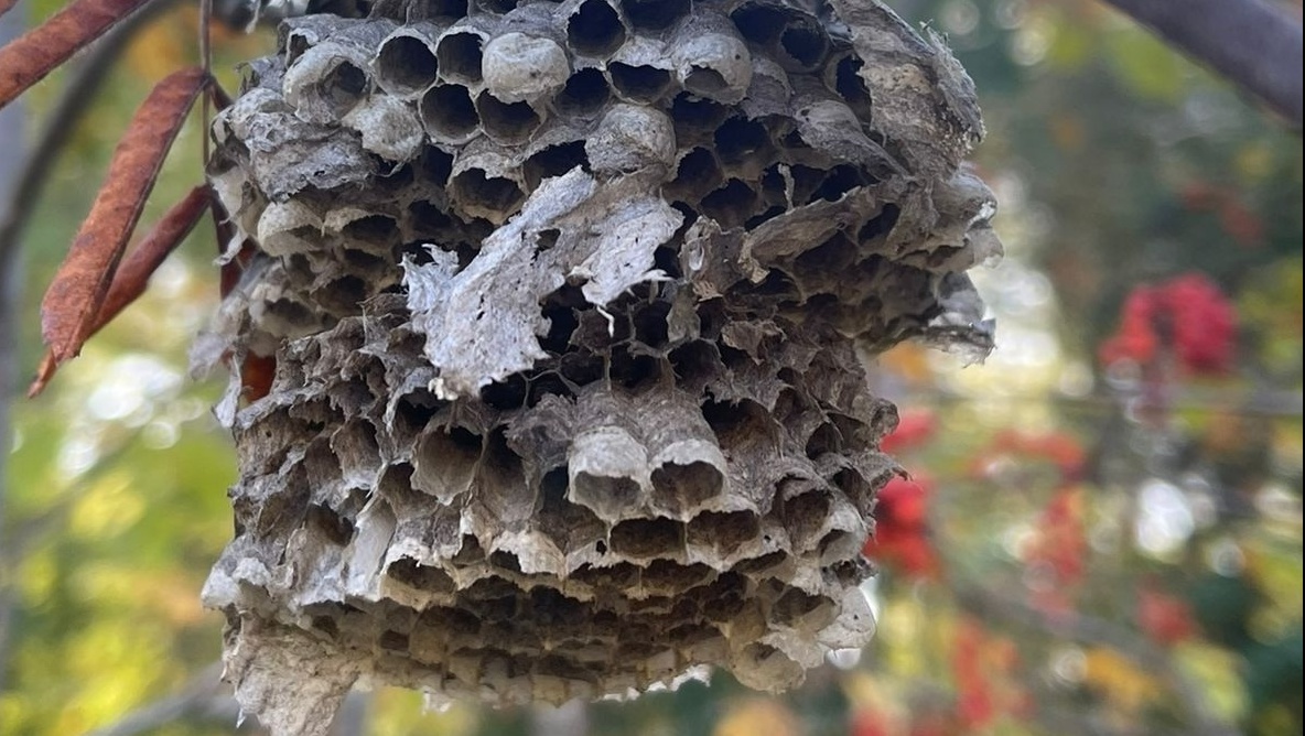 — Здесь комочек повторно пережёвывается и обильно смачивается слюной. Далее оса садится на край ячейки и, прижав комочек к стенке гнезда, пятясь назад, раскатывает его в полоску. Взяв полоску краями челюстей, она начинает растягивать её в длину. В дальнейшем такие полоски прикрепляются одна к другой, формируя бумажную стенку, — рассказали о нюансах стройки в Ботсаду.