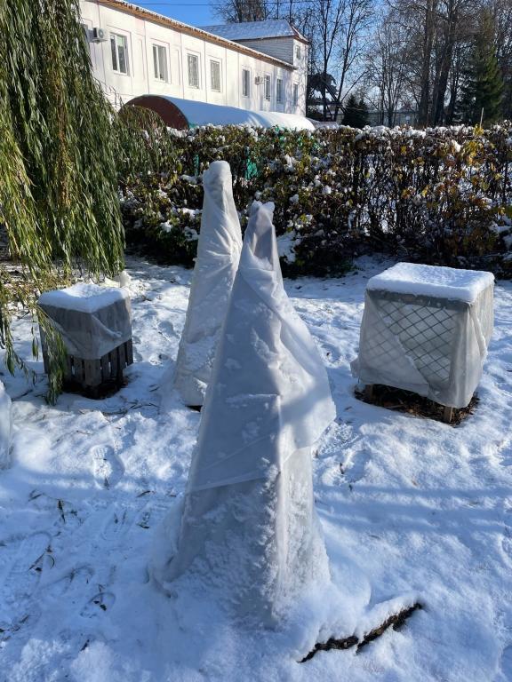 Чтобы растения с комфортом пережили зимние морозы и не замёрзли, для них подготовили специальные конструкции и еловые лапники.