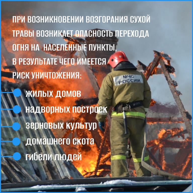 В администрации предупреждают, что любой окурок или спичка могут стать причиной пожаров, особенно опасна сухая трава. В ветреную погоду огонь быстро распространяется — перекидывается на леса, хозяйственные постройки и дома.