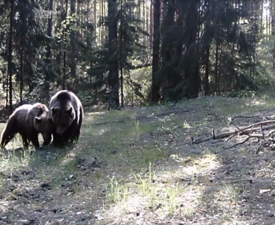 На видео видно, как влюблённая пара выходит к лесной дороге. Самец заметно крупнее. Он демонстрирует партнёрше свою мощную фигуру и крепкие лапы. Медведица — меньшего размера, она активно пытается привлечь внимание зверя: тыкается в него носом и подталкивает.