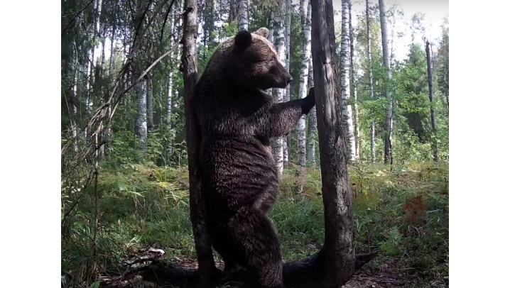 В очередной в поле зрения техники попал косолапый. Бурый медведь очень эротично двигался вокруг ствола молодой сосны.