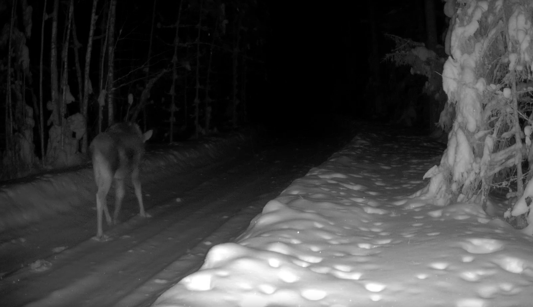 На этот раз в кадр попал лось. Животное уверенно идёт по дороге по своим делам. Немного пройдя по проторённой дорожке, сохатый сворачивает вглубь массива, где чувствует себя в полной безопасности.