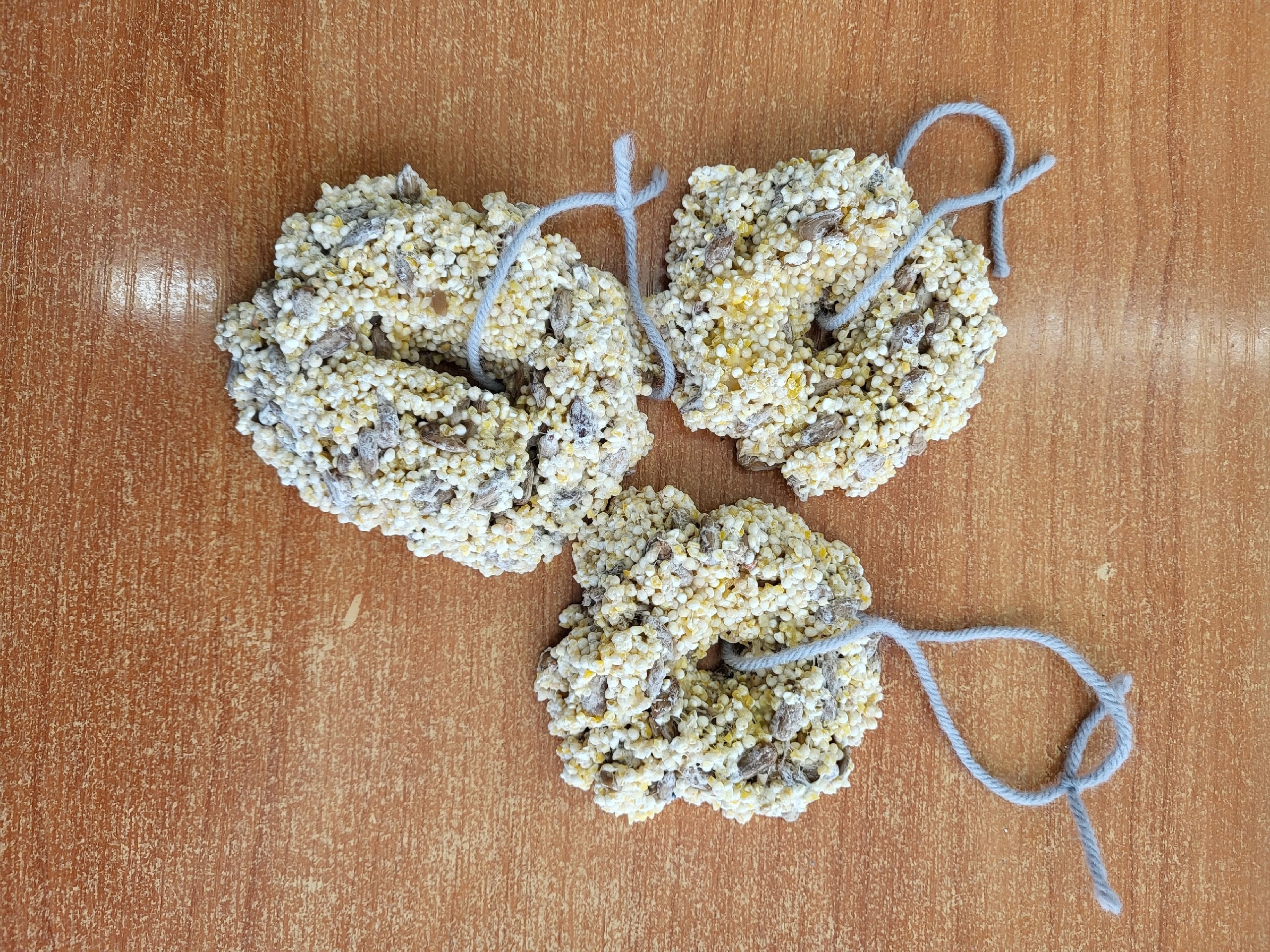 Ребята из 1 и 2 классов вместе со своими наставниками смастерили кормушки и изготовили зерновые кольца. Всё это дети дружно развесили на деревьях.
