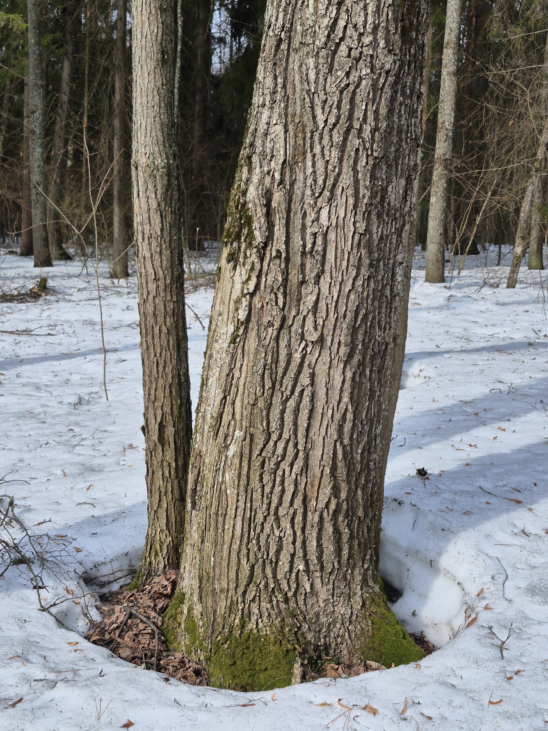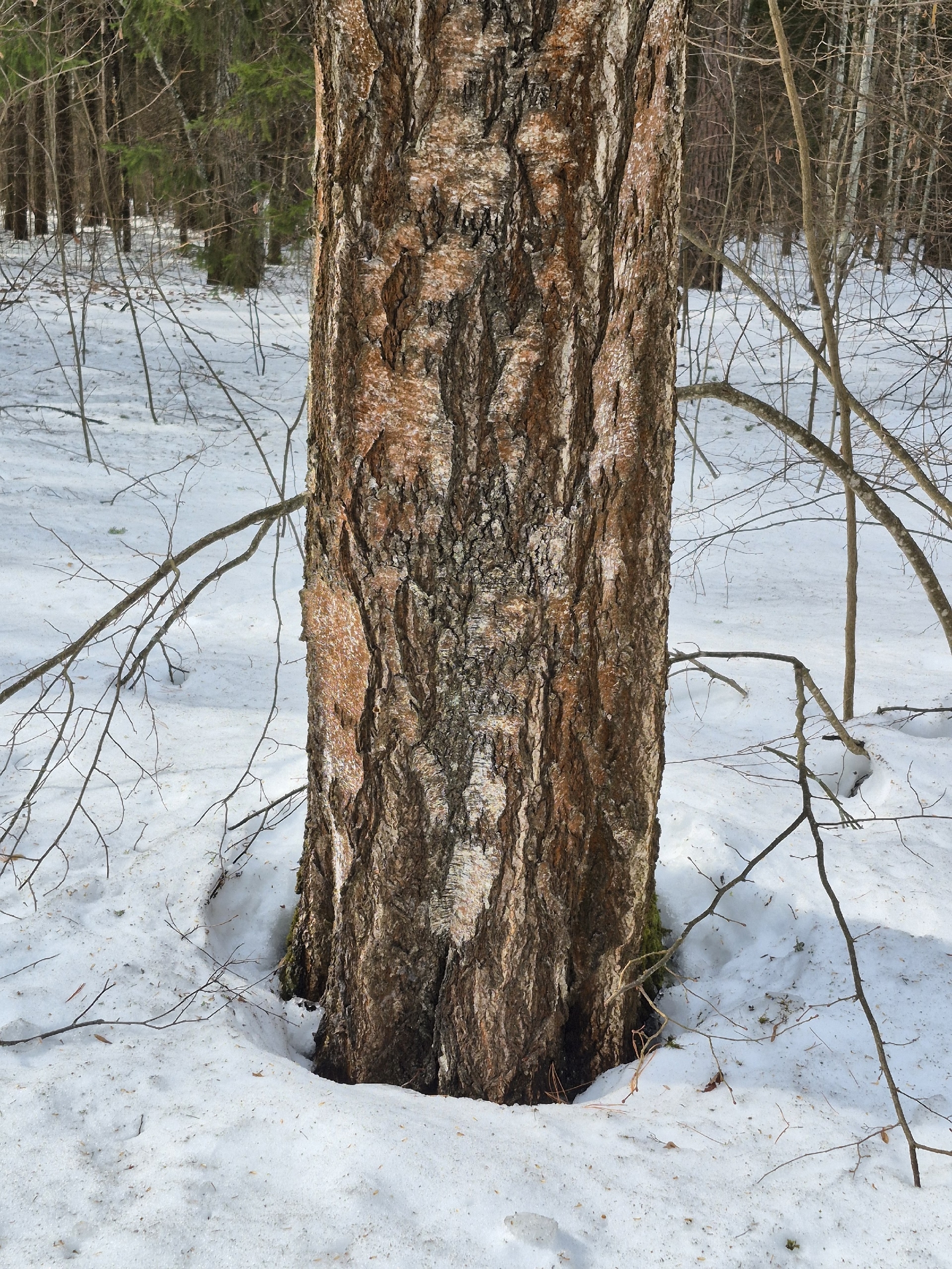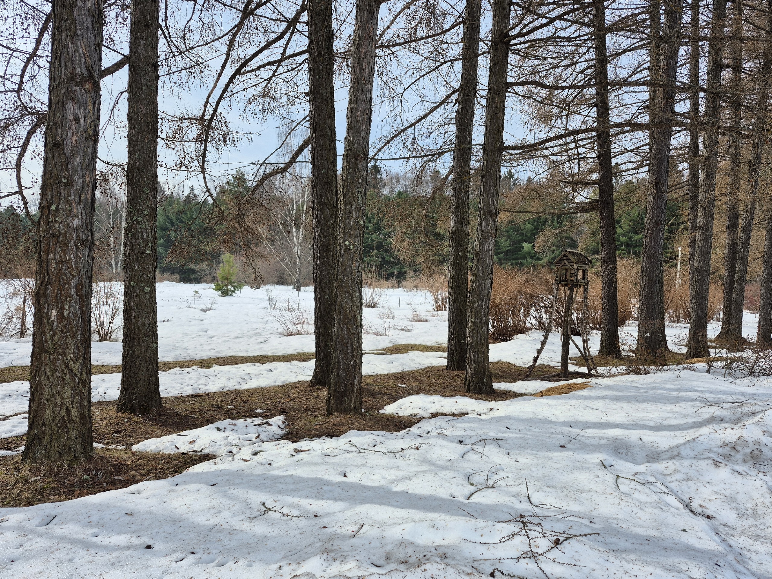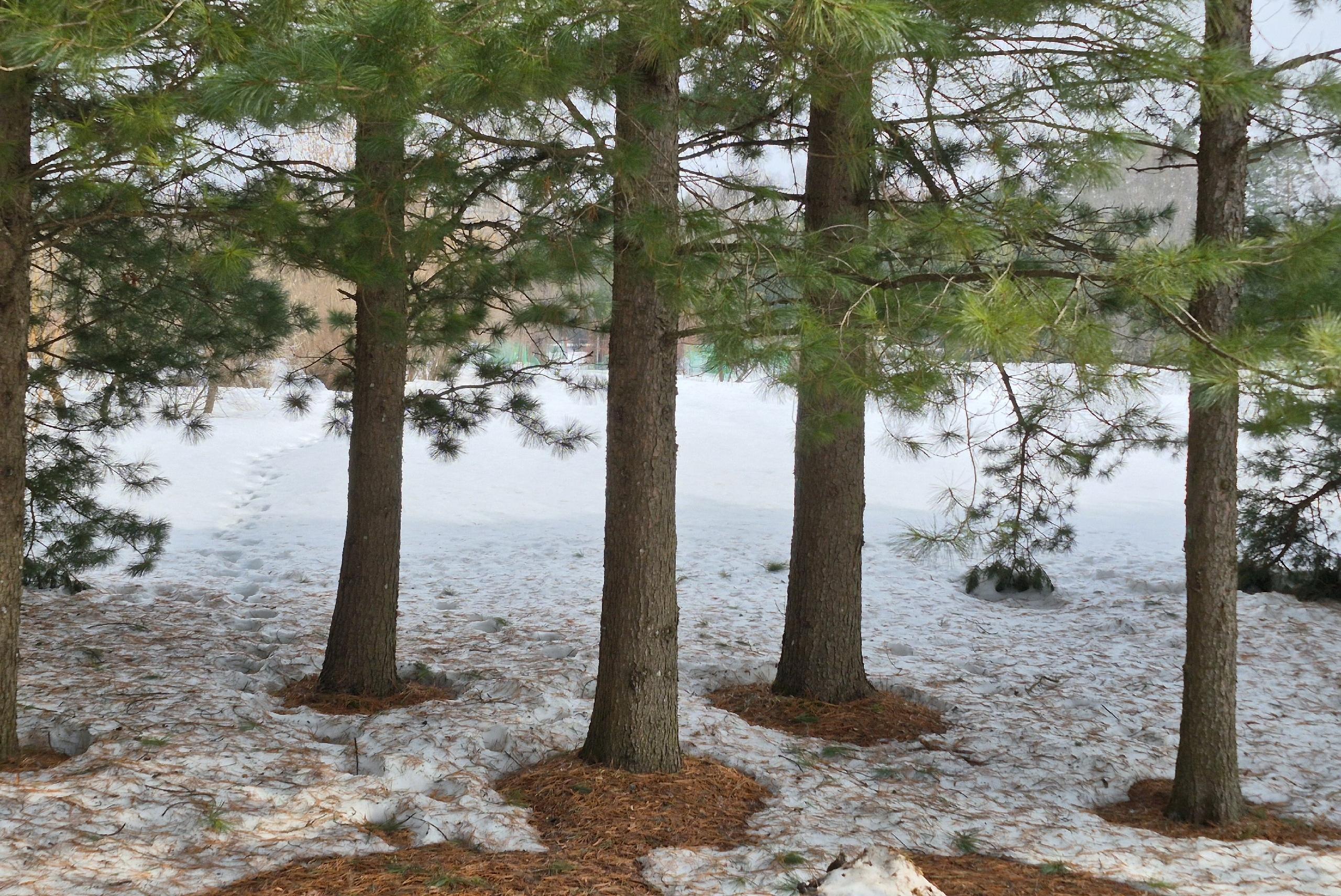 В густых хвойных лесах проталины у стволов часто появляются позже, чем в лиственных. Это связано с тем, что плотная крона елей и сосен создает больше тени и слабее прогревается солнцем.