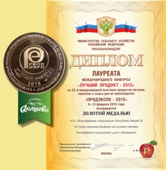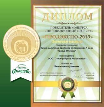 Агрохолдинг также завоевал золотую медаль в Международном дегустационном конкурсе «Лучший продукт-2015». Так по достоинству были оценены два продукта нашего производства — тушка цыплёнка-бройлера для детского питания и полуфабрикат «Рулет «Домашний». Требовательная конкурсная комиссия оценивала представленные образцы по разным показателям — от внешнего вида и упаковки до качества товара. Как результат, продукция птицефабрики «Акашевская» была признана лучшей.