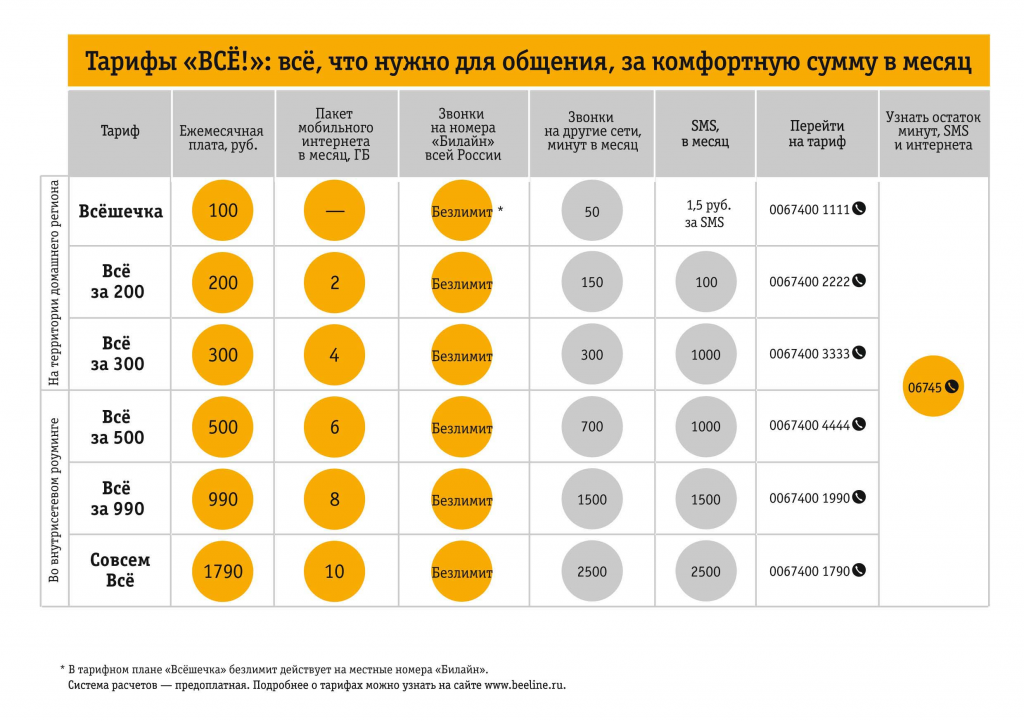 Более подробная информация о тарифных планах линейки «ВСЁ!», составе и объеме включенных услуг и размере абонентской платы на сайте www.beeline.ru