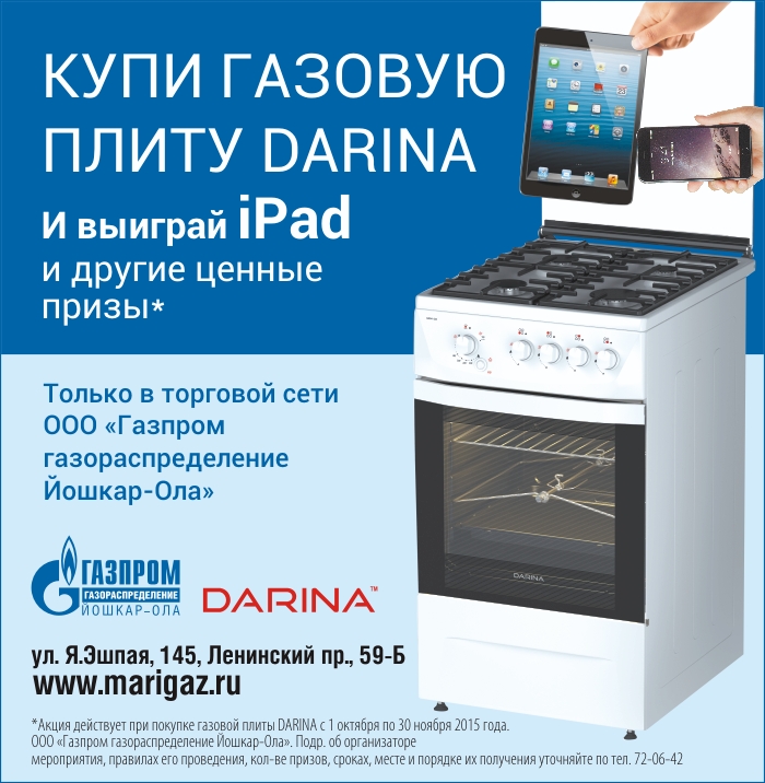 МариМедиа, 21 октября. Компания «Газпром газораспределение Йошкар-Ола» проводит рекламную акцию для покупателей газовых плит «Дарина».