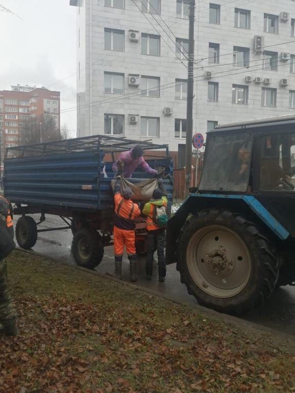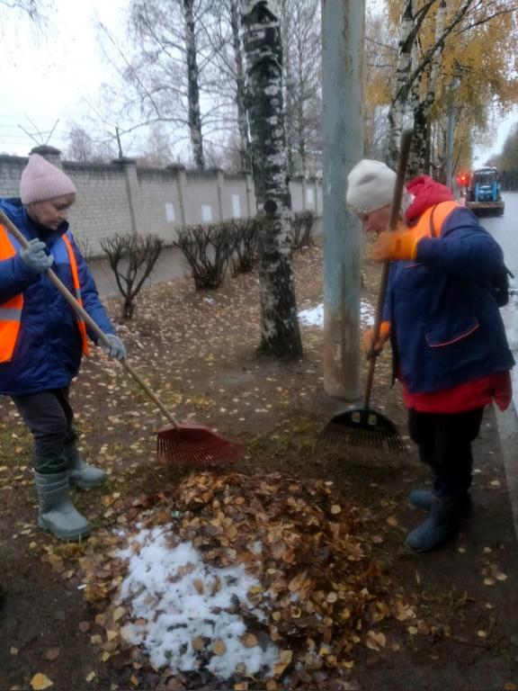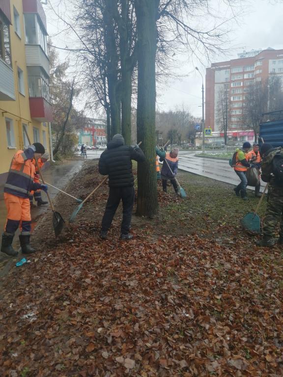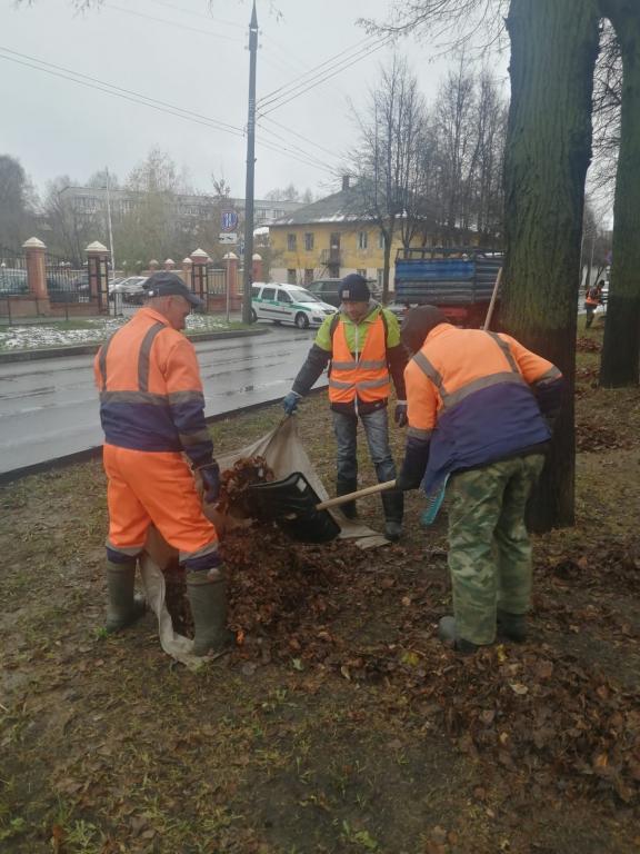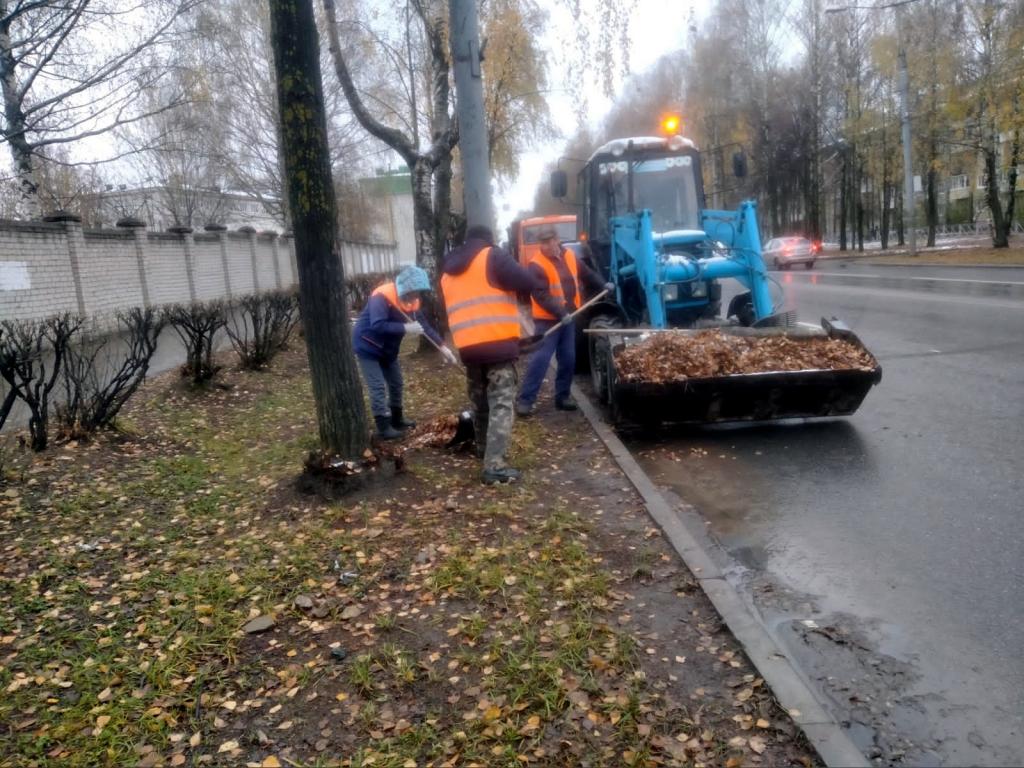 Сегодня на ул. Машиностроителей и ул.Я. Эшпая убирают опавшие листья с придорожных газонов.