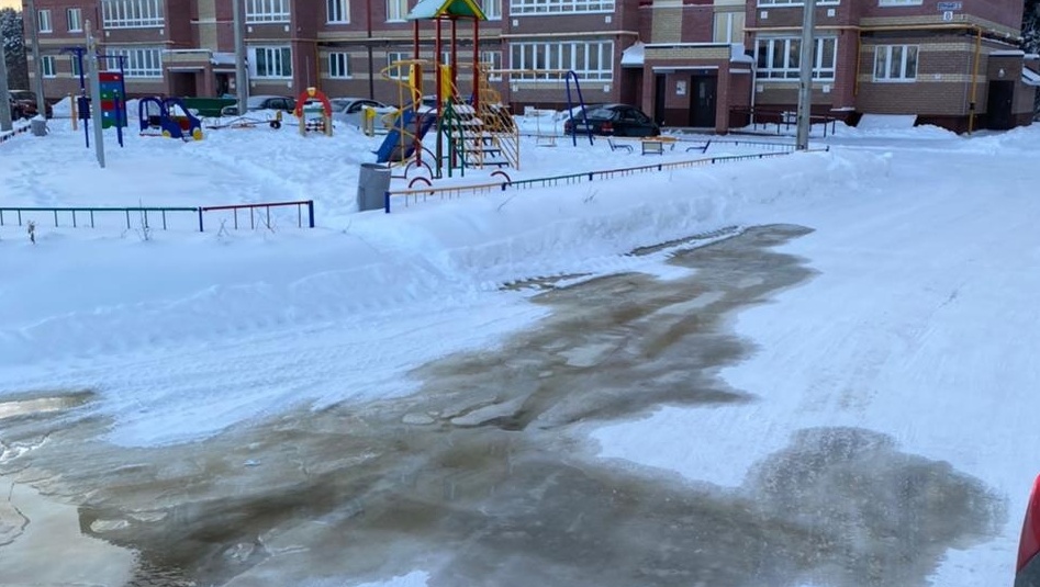 Во дворах новостроек жилого комплекса «Сосны» в Руэме текут ручьи отходов. Территорию трёх девятиэтажек буквально заливает канализация.