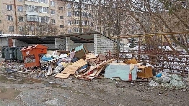 Во дворе по улице Вознесенской, 74 в Йошкар-Оле возникла проблема с уборкой контейнерной площадки. Там образовались большие залежи мусора, а управляющие компании не спешили расчищать территорию.