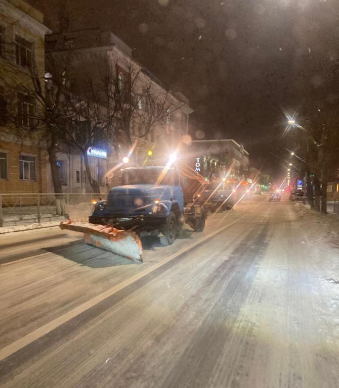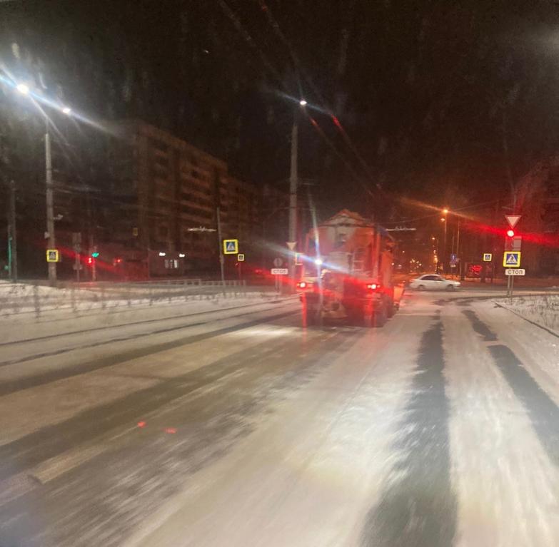 Так, минувшей ночью дорожники вновь вели борьбу со снегом. На дорогах работала техника, проезжие части улиц счищали от снега. Где-то применяется и ручной труд.