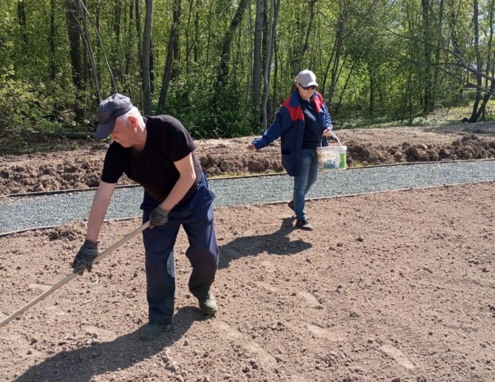 В Марий парке тоже кипела работа. Здесь обустраивали газоны, выравнивали участки и посеяли семена.